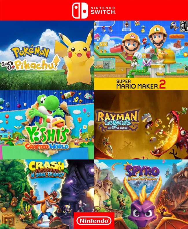 Pokémon Lets Go Pikachu mas Super Mario Maker 2 mas Yoshis Crafted World mas Rayman Legends Definitive Edition mas Crash Bandicoot N Sane Trilogy mas Spyro Reignited Trilogy - Nintendo Switch