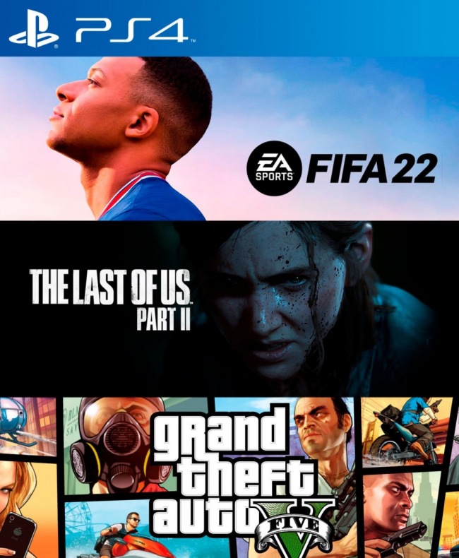 El pack incluye: - FIFA 22 PS4 - The Last of Us Part II Ps4 - Grand Theft Auto V PS4 Pesos de los juegos : 158 GB Requerido en consola : 190 GB Instalación : 1 consola